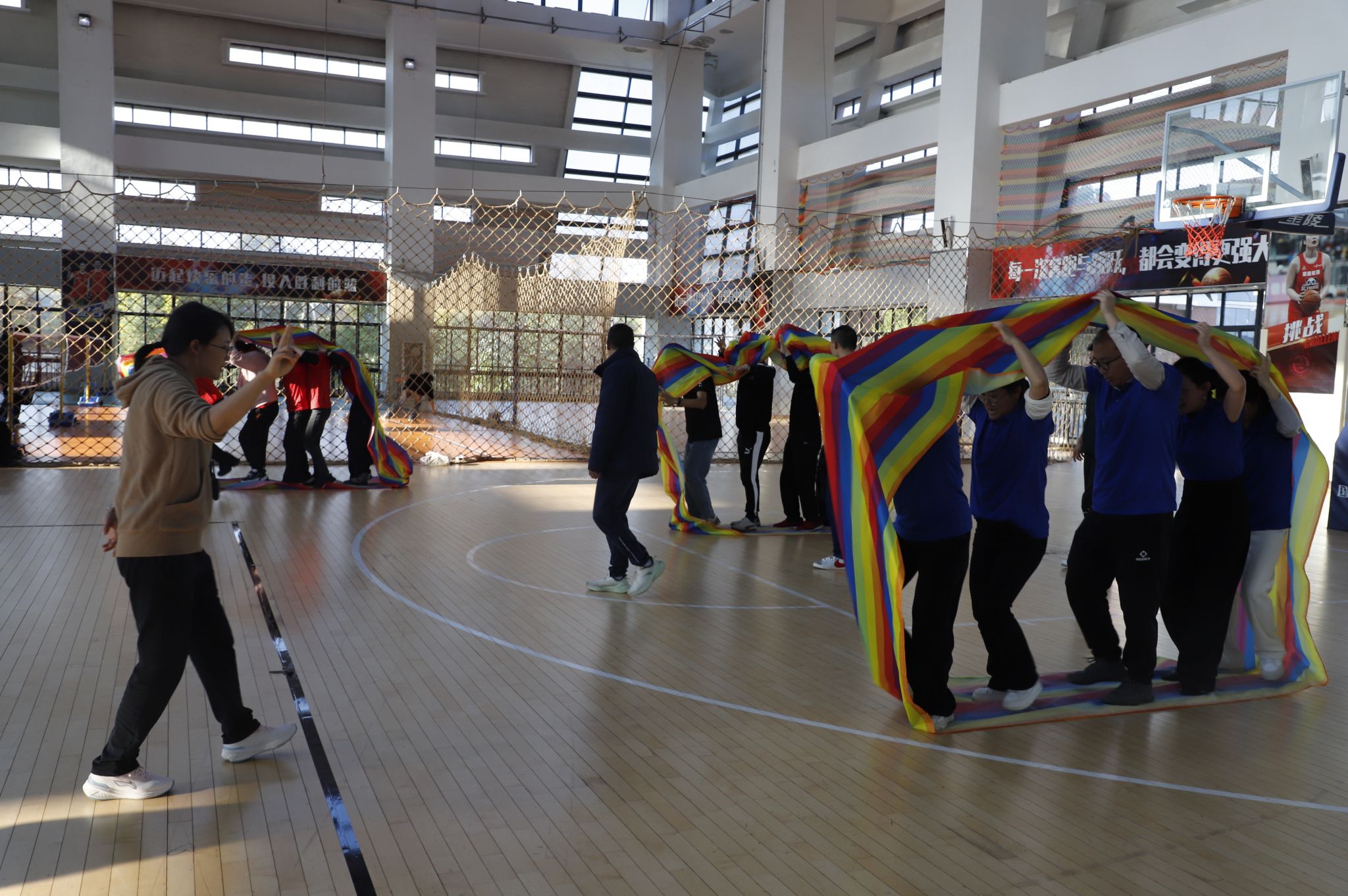 开幕式结束后,趣味运动会飞镖、鼓上颠球、无敌风火轮三项趣味项目同步开展,体育馆内欢呼声此起彼伏。在鼓上颠球赛场,现场计数声与加油声交织;无敌风火轮项目中,队员们展现出极强的团队凝聚力。
